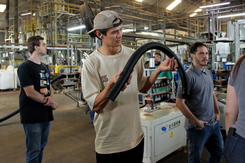 Em seguida, o grupo foi à indústria recicladora de plásticos Cimflex, onde os monitores do Museu, acompanhados pela coordenadora do projeto de Logística Reversa, entregaram os materiais recolhidos na sede do Mudi para o devido encaminhamento. A visita também permitiu compreender de que forma resíduos, como o plástico, podem ser reciclados e reaproveitados.