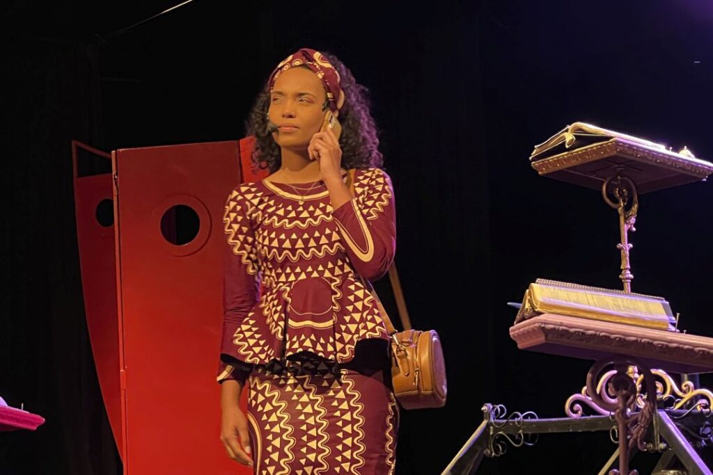 Porém, Katharina foi além da monitoria. Por meio do projeto de extensão do grupo de teatro ‘Arte, Ética e Cidadania’, que encena a peça “O Auto da Barca do Fisco”, Katharina relembra os motivos que a levaram a participar do espetáculo, ao se apresentar como a personagem Arcanjo Rafaela, que este ano completa 20 anos de apresentações.