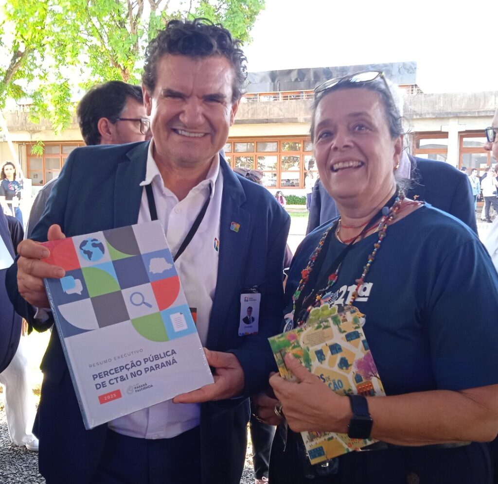 O diretor superintende do Itaipu Parquetec, Irineu Colombo, recebeu da coordenadora de Comunicação do NAPI Paraná Faz Ciência, jornalista Ana Paula Machado Velho, um exemplo da Pesquisa de Percepção Pública de Ciência, Tecnologia e Inovação no Paraná (PPCTI) (Foto/NAPI PRFC)