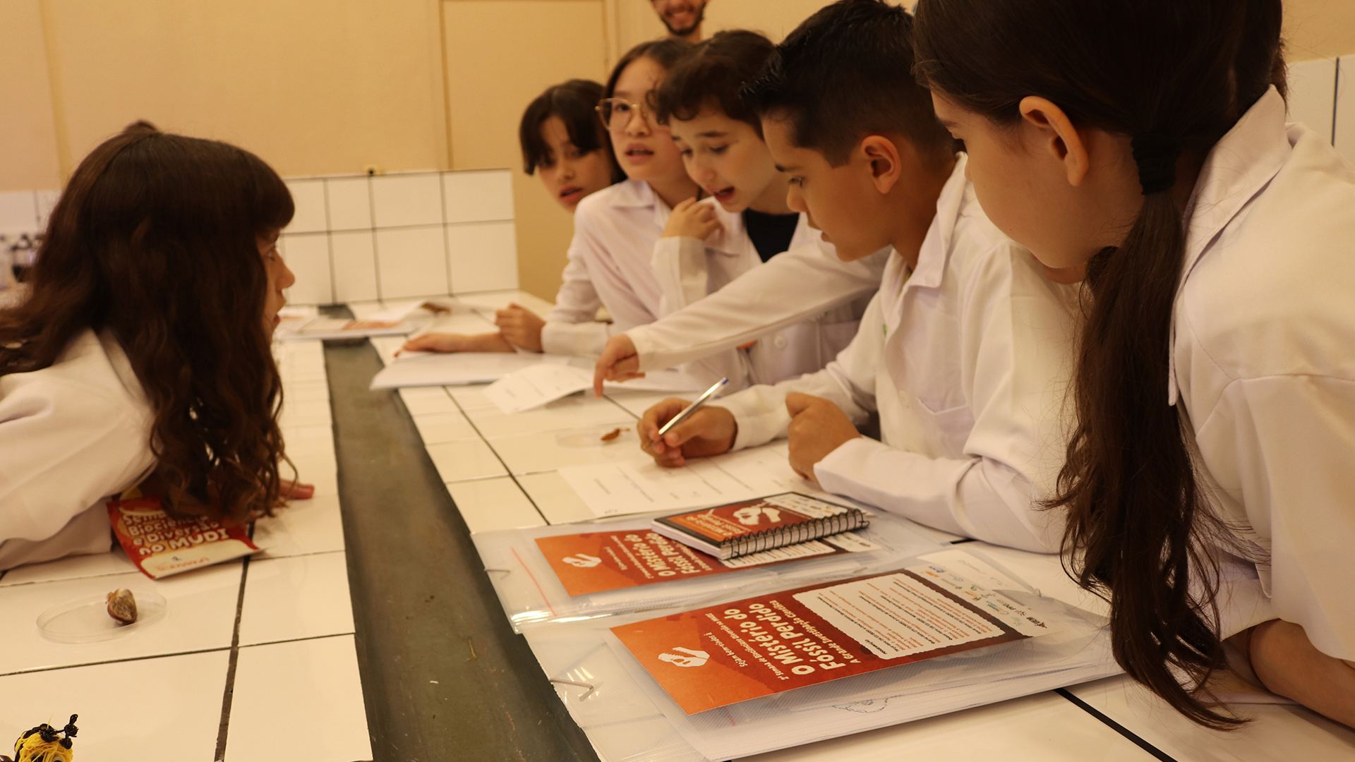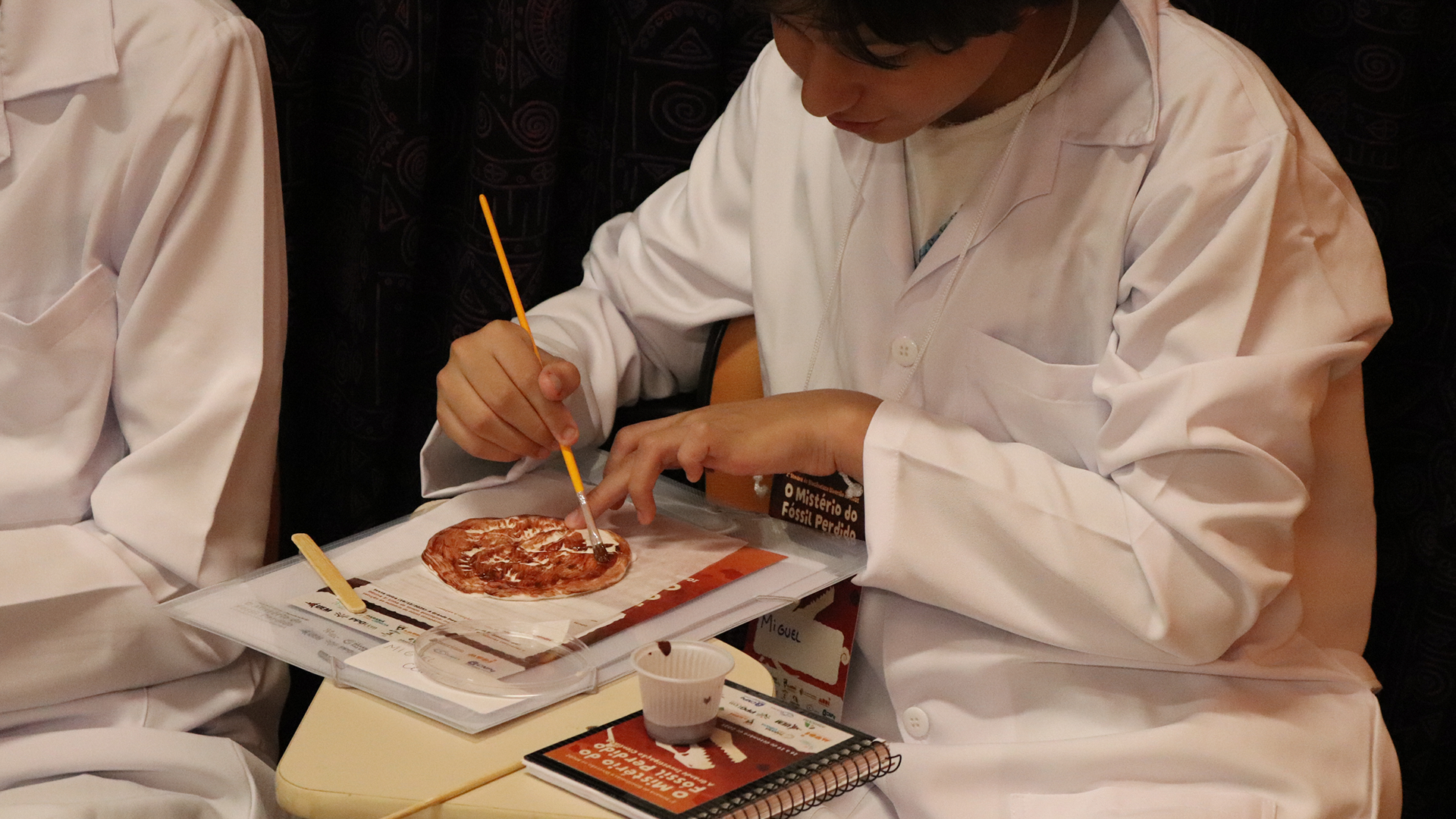 No primeiro dia, elas foram imersas na “Cena do Mistério”, onde exploraram os espaços da Química e da Paleontologia do Museu. A programação contou com oficinas de Papiloscopia, nas quais as crianças aprenderam técnicas de identificação, comparação e experimentação com impressões digitais, além da oficina de Produção de Fósseis Artificiais, que apresentou conceitos de fossilização e tempo geológico.