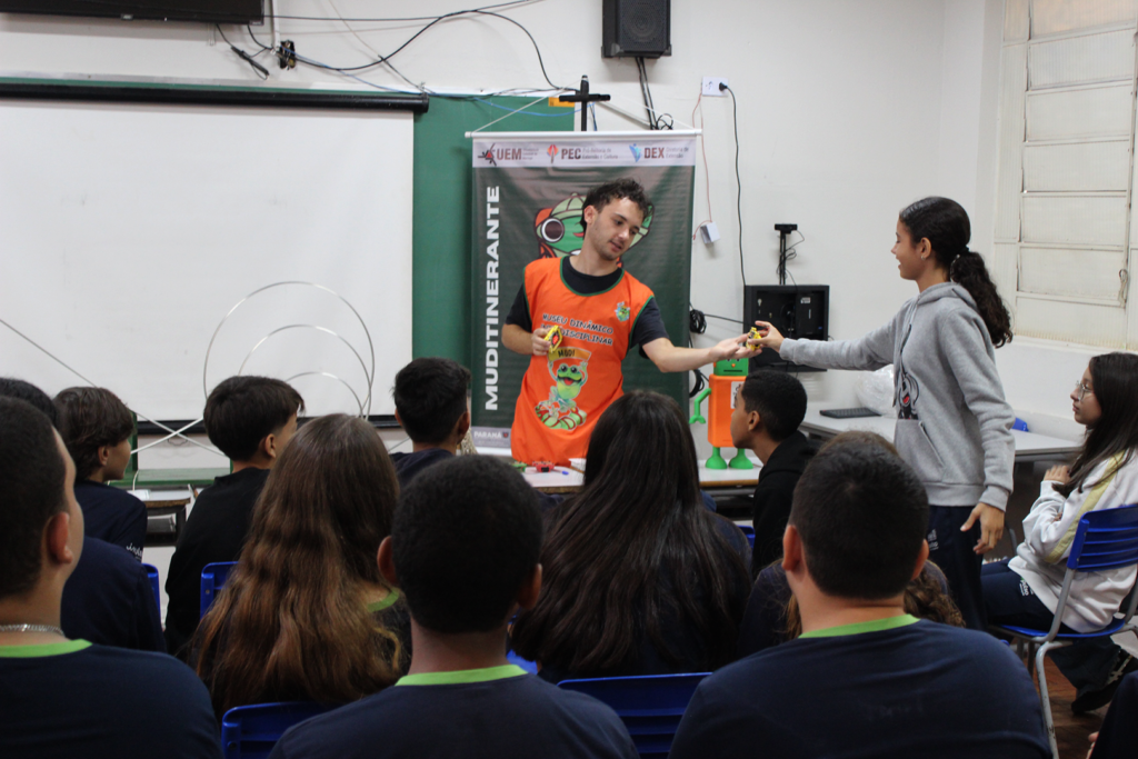 O Muditinerante, projeto de extensão do Museu Dinâmico Interdisciplinar (Mudi), da Universidade Estadual de Maringá (UEM), promoveu uma ação no Colégio Estadual Olavo Bilac em Sarandi, cidade vizinha a Maringá, para levar o universo da ciência e aproximar crianças e jovens da interdisciplinaridade do Mudi.