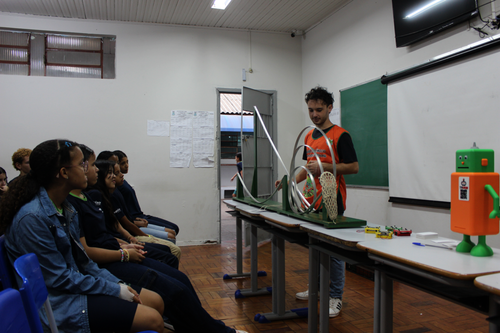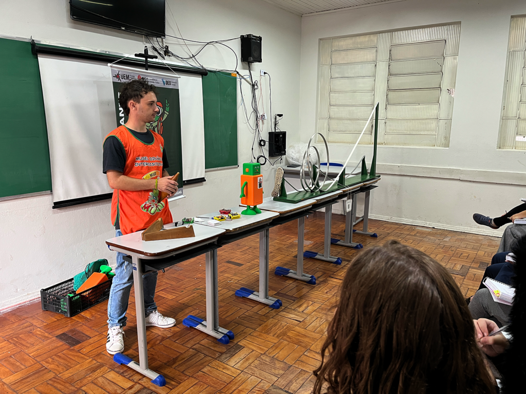 Na sala de Física, os estudantes participaram de diferentes atividades interativas que aproximaram conceitos científicos da prática. Entre elas estavam a montanha-russa experimental, que demonstra como funcionam a energia cinética, energia potencial e a atuação do atrito ao longo do percurso. Outra atração foi o cone antigravitacional, que cria uma ilusão de ótica ao dar a impressão de que um objeto se move contra a gravidade.